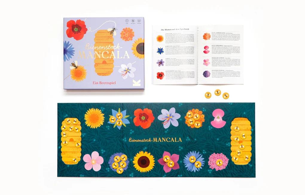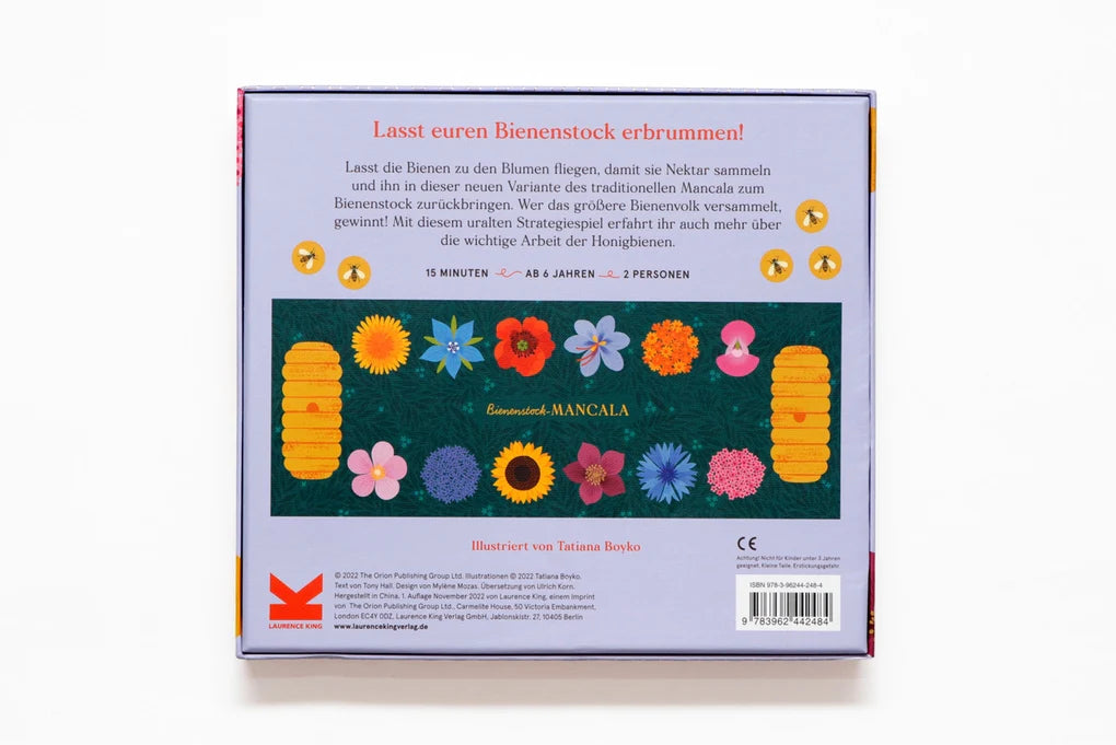 Der Bienenstock muss brummen! In dieser neuen Variante des uralten Strategiespiels, das schon im 2. Jahrhundert n. Chr. in Afrika und im Nahen Osten gespielt wurde, müssen die Bienen zu den Blumen fliegen, ihren Nektar sammeln und ihn zum Bienenstock zurückbringen. Wer das größere Bienenvolk versammelt, gewinnt! Im beiliegenden Booklet sind zudem viele wissenswerte Fakten über die dargestellten Blumen und die wichtige Arbeit der Honigbienen versammelt.