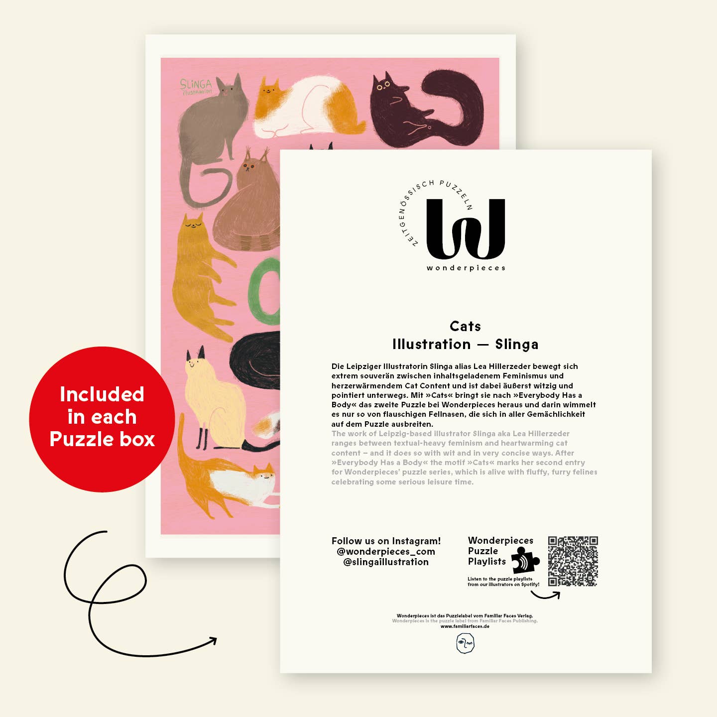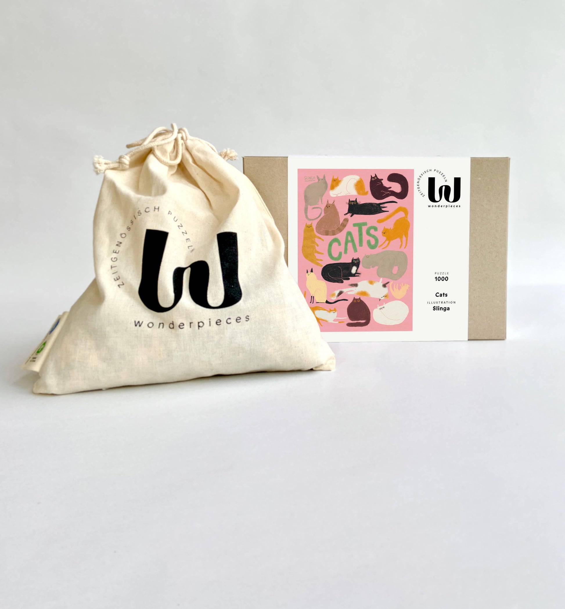 Mit dem Puzzle Cats bringt die Leipziger Illustratorin Slinga (alias Lea Hillerzeder) ihr zweites Motiv für Wonderpieces heraus – und es wimmelt nur so von flauschigen Fellnasen. In gewohnt pointierter und humorvoller Manier verbindet Slinga feministische Inhalte mit charmantem Cat Content und schafft ein Puzzle, das gleichermaßen zum Schmunzeln und Staunen einlädt.