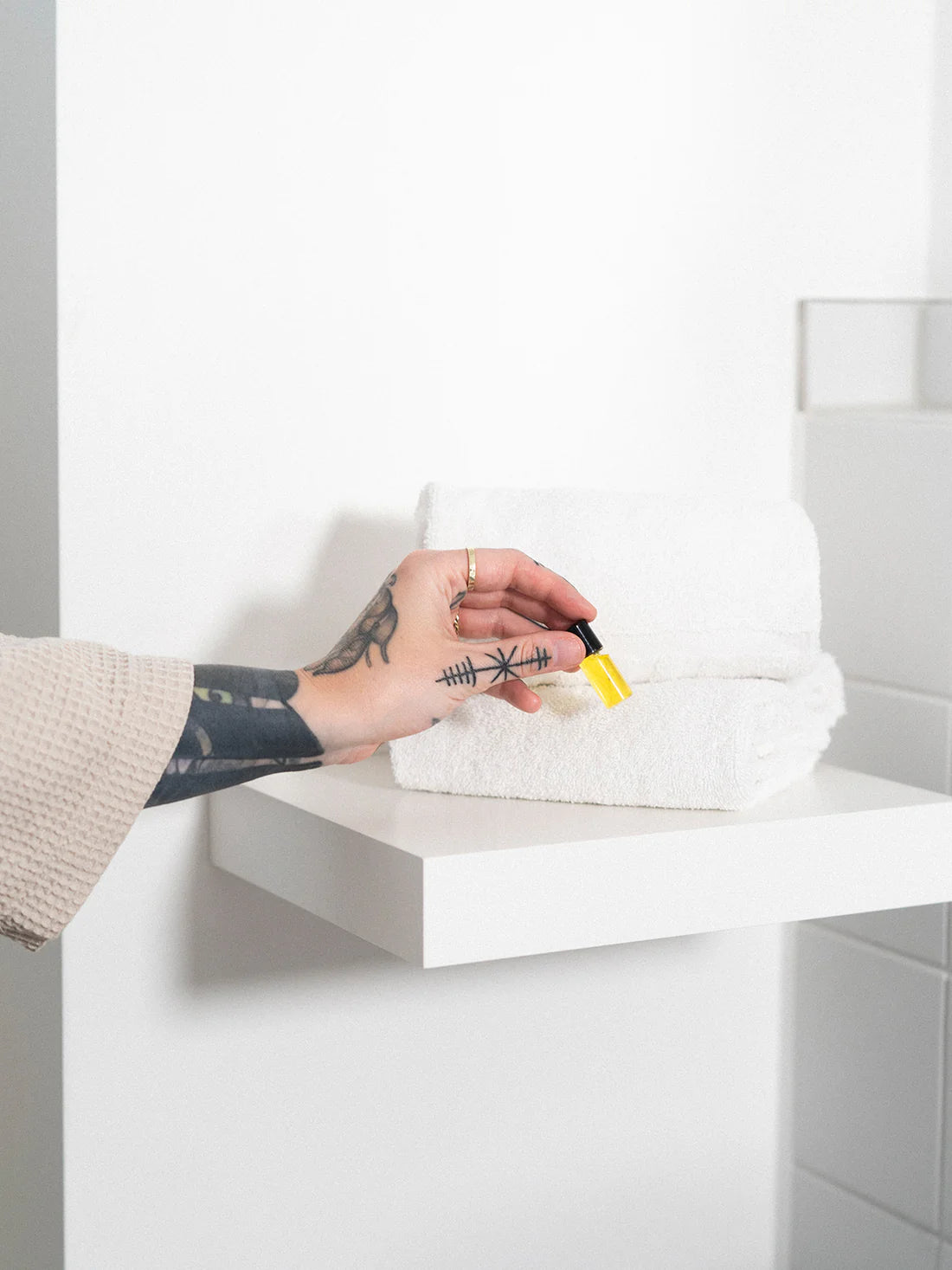 Mehrmals (z. B. 2-3x) über Schläfen, Nacken oder Schultern rollen. Tief einatmen & entspannen. Perfekt, wenn du unterwegs bist oder eine kurze Auszeit brauchst.
