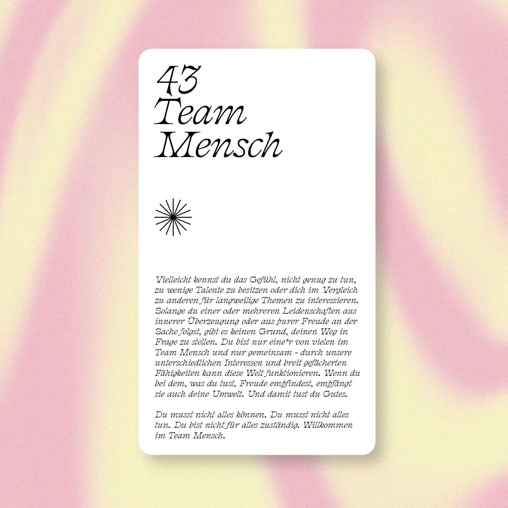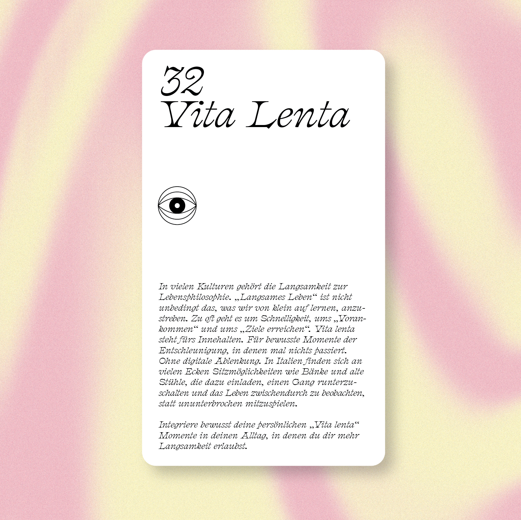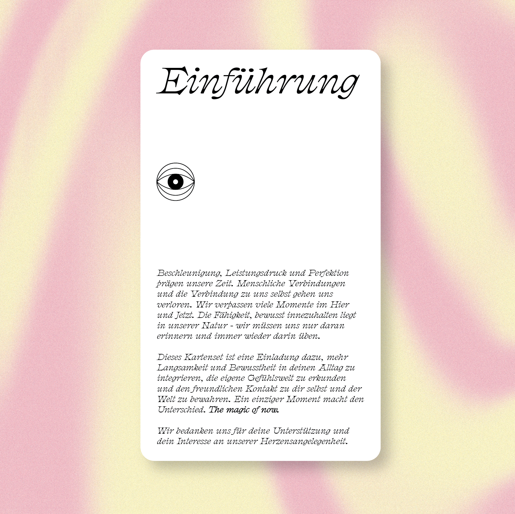 Beschleunigung, Leistungsdruck und Perfektion prägen unsere Zeit. Menschliche Verbindungen und die Verbindung zu uns selbst gehen uns verloren. Wir verpassen viele Momente im Hier und Jetzt. Die Fähigkeit, bewusst innezuhalten liegt in unserer Natur - wir müssen uns nur daran erinnern und immer wieder darin üben. Dieses Kartenset ist eine Einladung dazu, mehr Langsamkeit und Bewusstheit in deinen Alltag zu integrieren, die eigene Gefühlswelt zu erkunden und den freundlichen Kontakt zu dir selbst und der Welt zu bewahren.