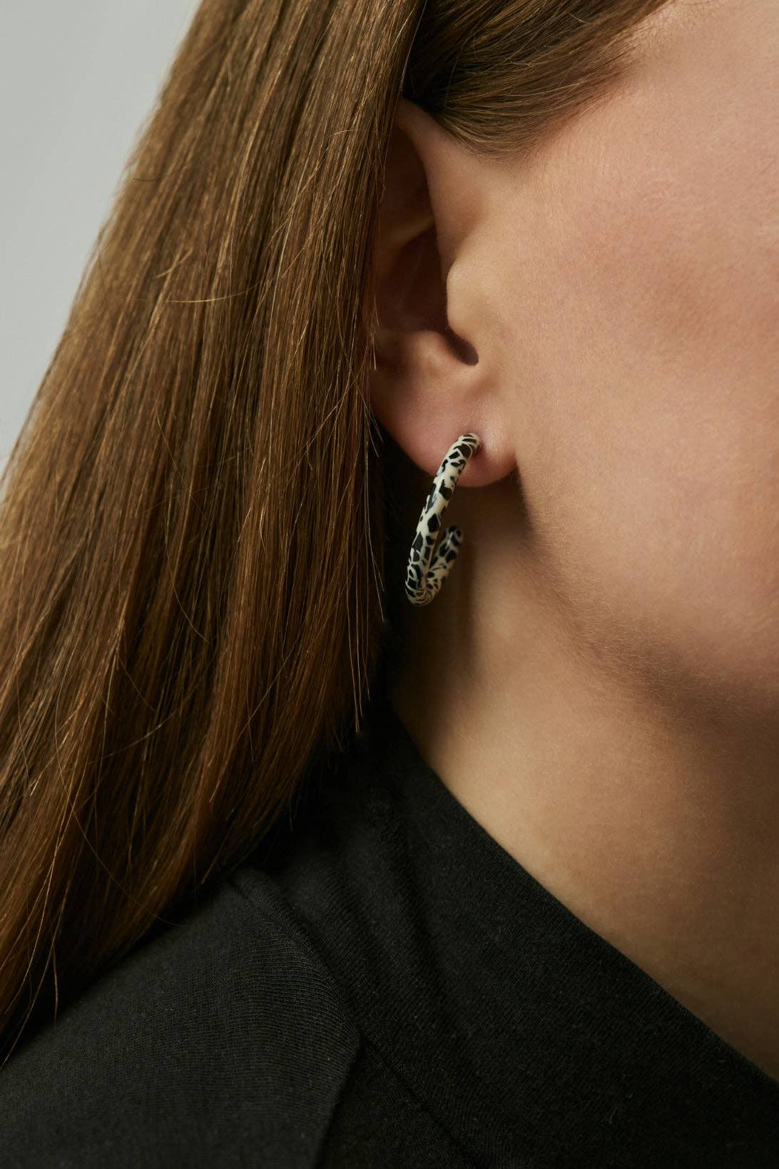 Die nickelfreien Loop Dott Ohrringe vereinen klares Design mit einem eleganten Schwarz-Weiß-Muster – ein zeitloser Look, der zu jedem Outfit passt. Leicht, bequem und nachhaltig gefertigt, sind sie das perfekte Accessoire für deinen Alltag.