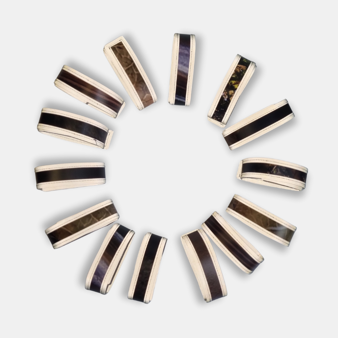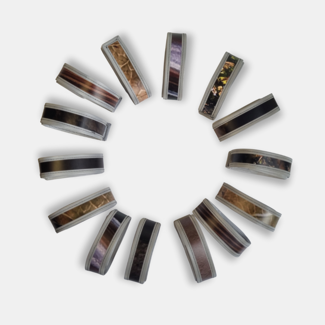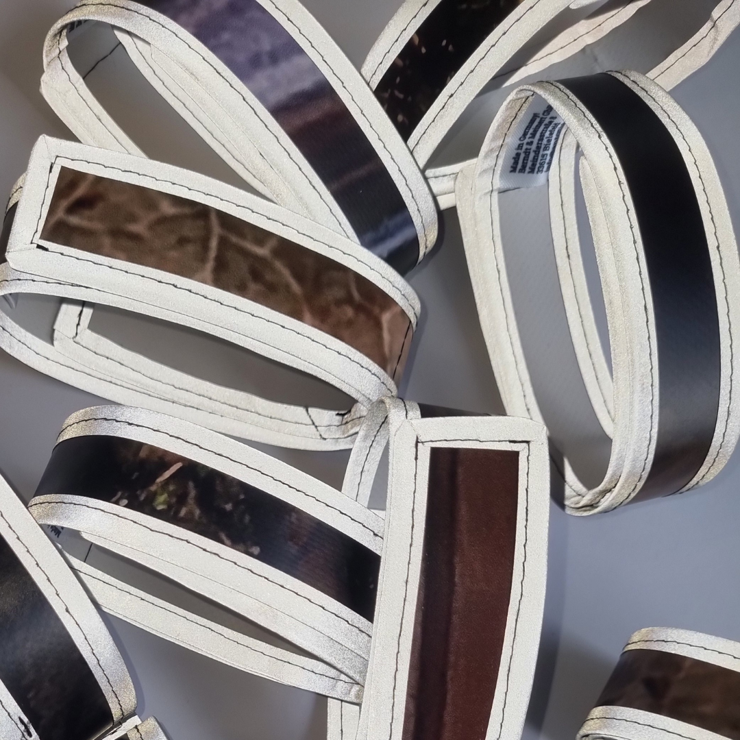 Gefertigt werden die Hosenbänder aus upgecycelter LKW-Plane mit aufgedruckten Fotografien. Die verwendeten Planen stammen aus der Ausstellung „Kinder Räume“ (2016, Kinderhaus am Mondsteinweg, Bielefeld) von Stefanie Schwedes und Veit Mette und sind mit Fotografien von Stefanie Schwedes bedruckt. Somit ist jedes Band ein Unikat – Farbe, Motiv und kleinere Gebrauchsspuren variieren.